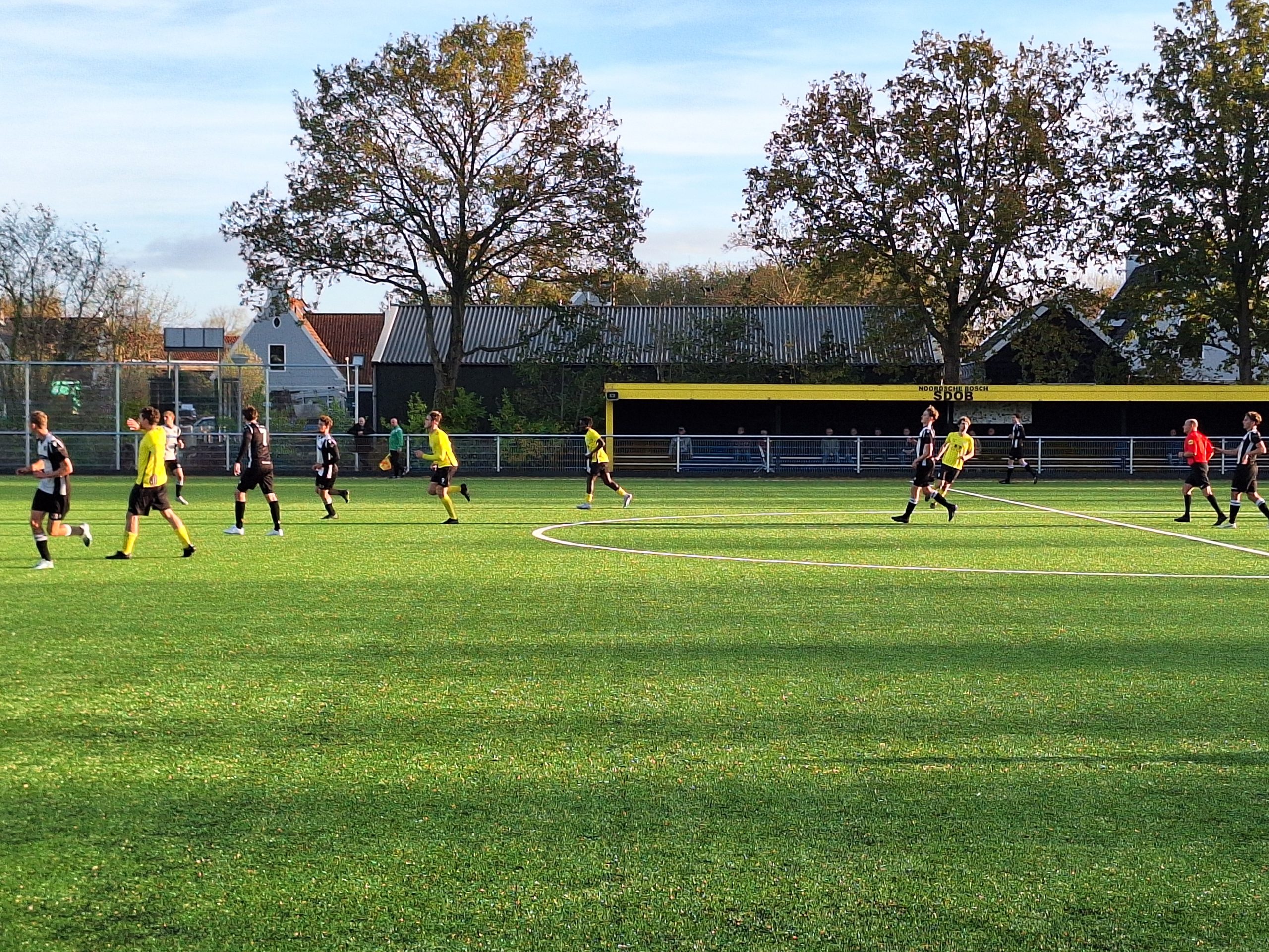 SDOB, Sterk Door Onderling Begrip, is de plaatselijke voetbalclub en die moesten vandaag aantreden tegen de v.v. IJmuiden. SDOB op de 4e plaats en IJmuiden op de 3e. Beide teams hebben 10 punten uit 5 wedstrijden. SDOB met tien doelpunten voor en acht tegen en IJmuiden zet daar 11-8 tegenover. Nadat IJmuiden de eerste wedstrijd van deze competitie van HCSC verloor is het team met een andere veldbezetting gaan spelen en verloor daarna niet meer. Gisteren werd de wedstrijd na 80 minuten bij de stand van 0-1 gestaakt.