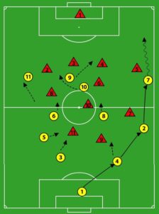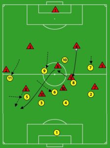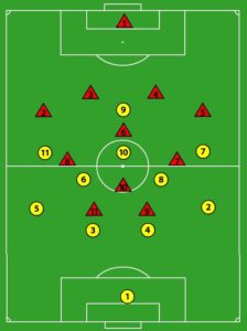 Bij balverlies zakt de ploeg meestal in, uitzonderingen daargelaten wanneer er pressie gespeeld wordt. De aanvallende middenvelders en de spits beginnen met verdedigen rond de middencirkel. Dan valt er als gezegd een ruimte tussen de linies waar tegenstanders gebruik van maken. De aansluiting is niet goed.